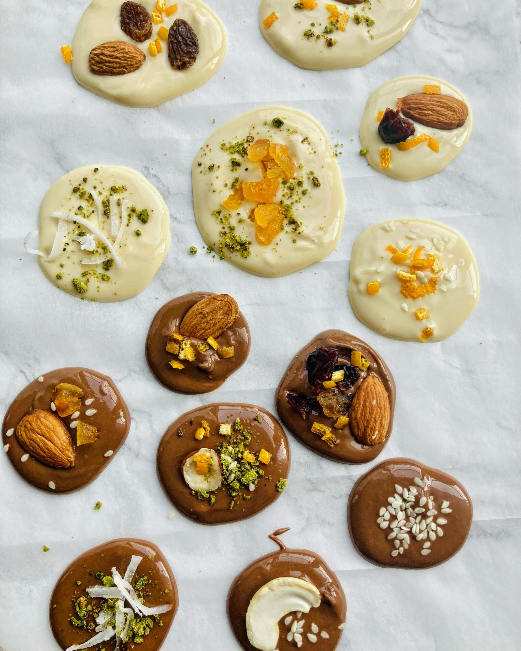 - Para a opção de bombom aberto, despeje porções de chocolate em uma travasse coberta por papel manteiga. Por cima, adicione as castanhas.